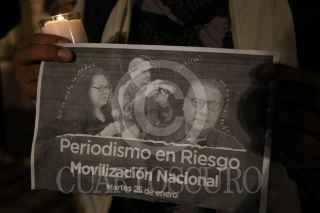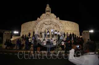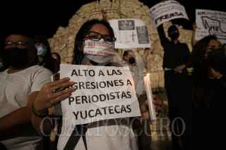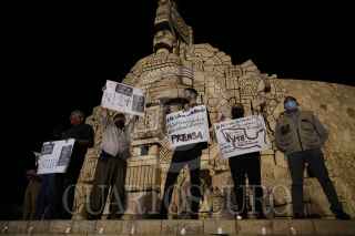 MÉRIDA, YUCATÁN, 22ENERO2022.- Cómo parte de la movilización nacional en contra de la violencia que sufre el gremio de periodistas en el país, esta noche decenas de periodistas de la entidad se manifestaron en el monumento a la Patria para exigir justicia por los asesinatos de los colegas Margarito Martínez y Lourdes Maldonado, en dias pasados en la ciudad de Tijuana. FOTO: MARTÍN ZETINA /CUARTOSCURO.COM