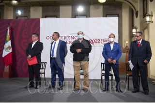 CIUDAD DE MÉXICO, 26ENERO2022.- Andrés Manuel López Obrador, presidente de México, encabezó la conferencia mañanera de este miércoles donde estuvo acompañado por la secretaria de Trabajo, Luisa María Alcalde y por José Luis Gómez Hernández, Pablo González de los Santos, Gerardo David Herrera Malagón, Esteban Izquierdo Avalos y Jorge Martínez, aspirantes a ser elegidos como nuevo secretario general del Sindicato de Trabajadores de Petróleos de la República Mexicana. FOTO: PRESIDENCIA /CUARTOSCURO.COM