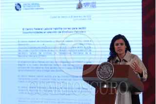 CIUDAD DE MÉXICO, 27ENERO2022.- Luisa María Alcalde Luján, secretaria del Trabajo y Previsión Social encabezó la intervención de candidatos a secretario general del Sindicato de Trabajadores Petroleros de la República Mexicana (STPRM): Fred Antonio Navarro López, Jesús Ortega Ramírez, César Pecero Lozano, Rubí Quintanilla Rincón, Cecilia Margarita Sánchez Gracía. Se llevó a cabo en Palacio Nacional. FOTO: ANDREA MURCIA /CUARTOSCURO.COM
