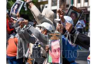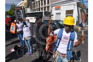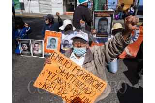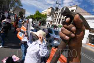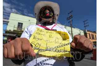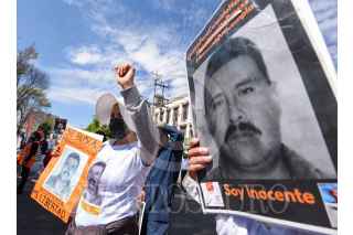 TOLUCA, ESTADO DE MÉXICO, 27ENERO2022.- Integrantes de Haz Valer mi Libertad se manifestaron durante el Segundo Informe del Magistrado Ricardo Sodi Cuellar Presidente del Tribunal Superior de Justicia del Estado de México, de rodillas pidieron que sus familiares presos sean beneficiados con la Ley de Amnistía, durante meses los jueves han realizado protestas y marchas exigiendo que sus casos sean revisados, hoy acudieron ataviados con prendas de sus familiares de los trabajos que realizan en libertad. FOTO: CRISANTA ESPINOSA AGUILAR /CUARTOSCURO.COM