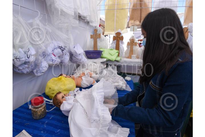 TOLUCA, ESTADO DE MÉXICO, 28ENERO2022.- Comerciantes de temporada que se dedican a la reparación de imágenes religiosas como el Niño Dios y venta de vestidos, se encuentran instalados en el estacionamiento del Parque Colosio en la ciudad de Toluca, reportan que han tenido bajas ventas y esperan que esta situación mejore este fin de semana, a unos días de la celebración del Día de la Candelaria. El año pasado no pudieron instalarse por las diversas medidas que se mantuvieron ante la contingencia por COVID-19. FOTO: CRISANTA ESPINOSA AGUILAR /CUARTOSCURO.COM