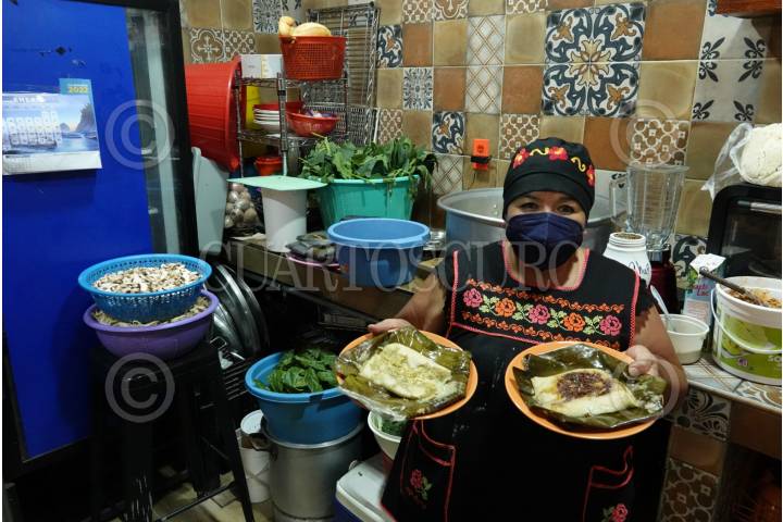 CIUDAD DE MÉXICO, 30ENERO2022.- Verónica Mendoza, conocida como Doña Vero, de 57 años, comenzó a elaborar tamales para la celebración del Día de la Candelaria desde hace dos años debido a la pandemia por el Covid-19, para su restaurante de cocina extravagante "Doña Vero". Durante tres semanas previas, ella y sus ayudantes Paola, Gisela y Lizbeth, comienzan la preparación de 150 a 200 tamales dulces y salados elaborados a base de hoja de maíz y hoja de plátano para el restaurante. Los sabores salados son carne de res en adobo, cochinita pibil, pollo en salsa verde y chapulines; los dulces son piñón, queso con zarzamora, chocochispas y mango, así como los "Verito veganos" que no contienen ingredientes de origen animal. La preparación para los tamales es amasar la masa, removerla al fuego y dejarla enfriar; posteriormente formar los tamales con las hojas cortadas y los guisados preparados, y finalmente poner a cocinar en vaporeras. El restaurante "Doña Vero" se encuentra en Monterrey 313, colonia Roma Sur, alcaldía Cuauhtémoc y su horario de atención es de lunes a jueves de 9 a 23 horas, viernes y sábado de 10 a 1 o 2 am y los domingos de 10 a 20 horas. FOTO: GRACIELA LÓPEZ /CUARTOSCURO.COM