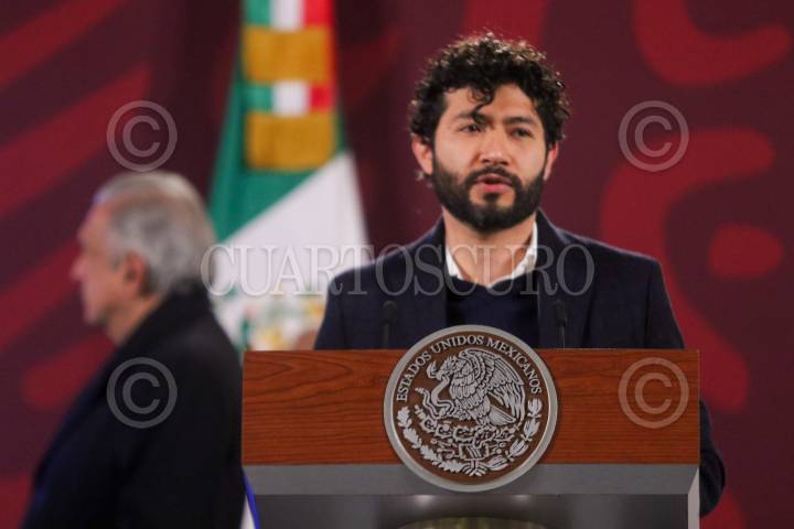 CIUDAD DE MÉXICO, 31ENERO2022.- Andrés Manuel López Obrador, Presidente de México, durante la conferencia de prensa en el Salón Tesorería de Palacio Nacional. Lo acompañaron: Ariadna Montiel Reyes, secretaria de Bienestar; Juan Pablo de Boton, subsecretario de Egresos de Hacienda; María Rocío García, subsecretaria de Bienestar; Carlos Torres Rosas, coordinador de Programas Integrales para el Desarrollo; Ricardo Sheffield Padilla, procurador Federal del Consumidor; Marath Bolaños López, subsecretario de Empleo y Productividad Laboral; Pamela López Ruíz, titular del Programa La Escuela es Nuestra, y Abraham Vázquez Piceno, coordinador del Programa de Becas para el Bienestar. FOTO: MOISÉS PABLO/CUARTOSCURO.COM
