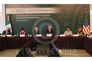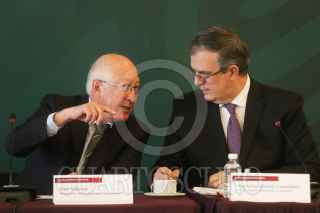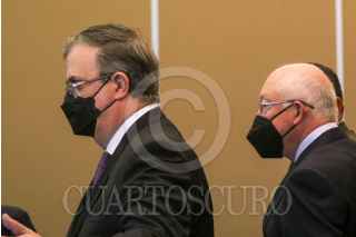 CIUDAD DE MÉXICO, 31ENERO2022.- Ken Salazar, embajador de Estados Unidos en México; Marcelo Ebrard Casaubon, secretario de Relaciones Exteriores; Rosa Icela Rodríguez, secretaria de Seguridad y Protección Ciudadana; Luis Cresencio Sandoval, secretario de la Defensa Nacional; Audomaro Martínez, director del Consejo Nacional de Inteligencia, y Miguel Ángel Méndez, encargado de la subprocuraduría jurídica y de asuntos internacionales en la FGR, durante los trabajos de resultados del Entendimiento Bicentenario entre México-Estados Unidos. FOTO: MOISÉS PABLO/CUARTOSCURO.COM