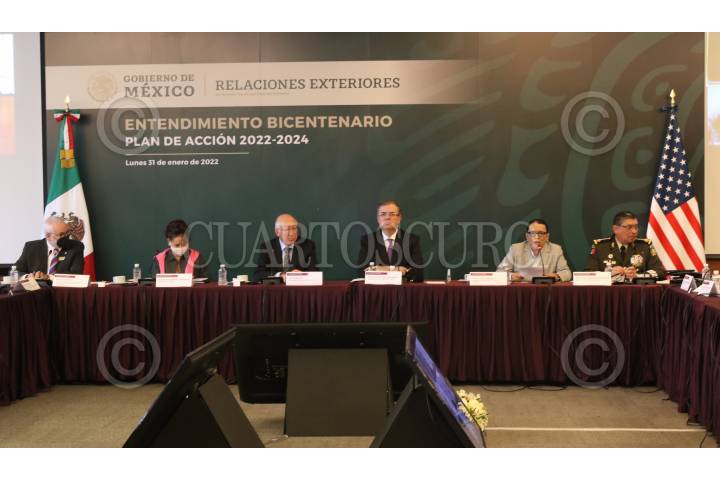 CIUDAD DE MÉXICO, 31ENERO2022.- Ken Salazar, embajador de Estados Unidos en México; Marcelo Ebrard Casaubon, secretario de Relaciones Exteriores; Rosa Icela Rodríguez, secretaria de Seguridad y Protección Ciudadana; Luis Cresencio Sandoval, secretario de la Defensa Nacional; Audomaro Martínez, director del Consejo Nacional de Inteligencia, y Miguel Ángel Méndez, encargado de la subprocuraduría jurídica y de asuntos internacionales en la FGR, durante los trabajos de resultados del Entendimiento Bicentenario entre México-Estados Unidos. FOTO: MOISÉS PABLO/CUARTOSCURO.COM