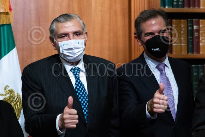 CIUDAD DE MÉXICO, 01FEBRERO2022.- Luis Rodríguez Bucio, comandante general de la Guardia Nacional; Adán Augusto López, secretario de Gobernación; Lorenzo Córdova, consejero presidente del INE; Rosa Icela Rodríguez, secretaria de Seguridad y Protección Ciudadana; José Agustín Pinchetti, titular de la Fiscalía Especializada en materia de Delitos Electorales (FEDE), y Ricardo Mejía Berdeja, subsecretario de Seguridad, durante la instalación de la Mesa de Seguridad Elecciones 2022 y Proceso de Revocación de Mandato, en la Biblioteca Manuel Gómez Morín de la SEGOB. FOTO: MOISÉS PABLO/CUARTOSCURO.COM