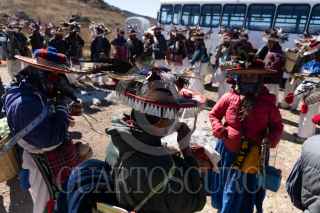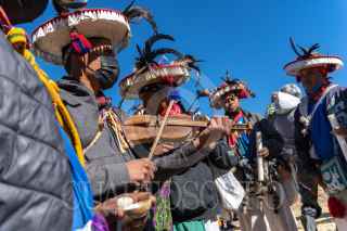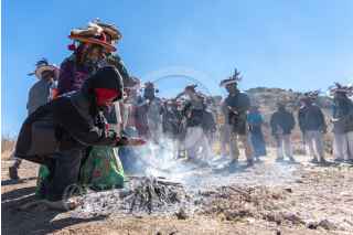 ZACATECAS, ZACATECAS, 02FEBRERO2022.- Representantes de la comunidad Wixárika se congregaron en el sitio sagrado "Makuipa", mejor conocido como el Cerro del Padre en la capital Zacatecana. La llegada de los peregrinos se dio el día de ayer 1 de febrero a las 3 de la tarde, para pasar la noche en este sitio sagrado. Antes de su partida realizaron un ritual de despedida donde se encendieron dos fogatas representando al abuelo fuego y los integrantes rindieron una ofenda antes de emprender su viaje hacia Wirikuta, Real de Catorce en San Luis Potosí. FOTO: DIANA VALDEZ /CUARTOSCURO.COM