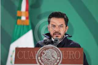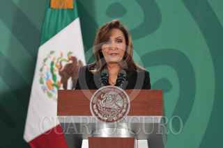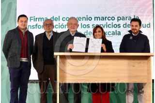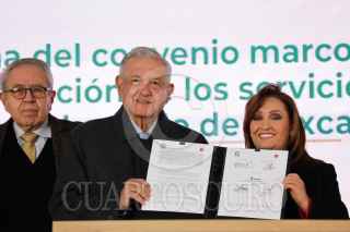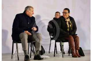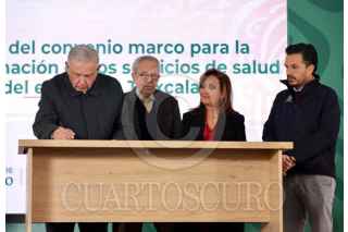 PANOTLA, TLAXCALA, 04FEBRERO2022.- Andrés Manuel López Obrador, presidente de México, y Lorena Cuéllar Cisneros, gobernadora de Tlaxcala, durante la mañanera que se realizó en la 23 Zona Militar, ubicada en la Autopista Tlaxcala-San Martín. Los acompañaron Luis Cresencio Sandoval, secretario de la Defensa Nacional (SEDENA); Zoé Robledo, director del IMSS; Jorge Alcocer Varela, secretario de Salud; Rosa Icela Rodríguez, secretaria de Seguridad y Protección Ciudadana (SSyPC). En el acto se firmo un convenio de colaboración en materia de salud para avanzar en la federalización en esta área. FOTO: PRESIDENCIA/CUARTOSCURO.COM