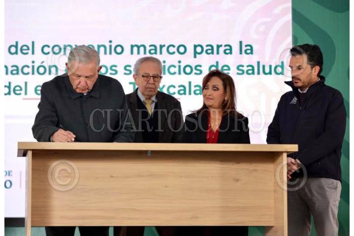 PANOTLA, TLAXCALA, 04FEBRERO2022.- Andrés Manuel López Obrador, presidente de México, y Lorena Cuéllar Cisneros, gobernadora de Tlaxcala, durante la mañanera que se realizó en la 23 Zona Militar, ubicada en la Autopista Tlaxcala-San Martín. Los acompañaron Luis Cresencio Sandoval, secretario de la Defensa Nacional (SEDENA); Zoé Robledo, director del IMSS; Jorge Alcocer Varela, secretario de Salud; Rosa Icela Rodríguez, secretaria de Seguridad y Protección Ciudadana (SSyPC). En el acto se firmo un convenio de colaboración en materia de salud para avanzar en la federalización en esta área. FOTO: PRESIDENCIA/CUARTOSCURO.COM