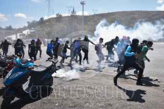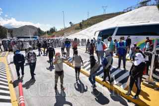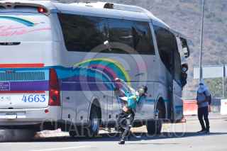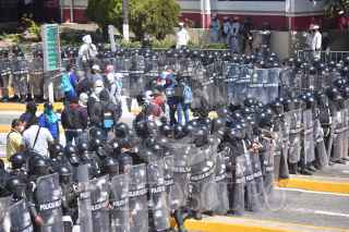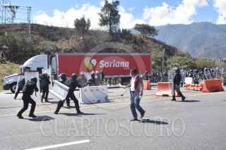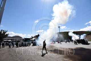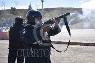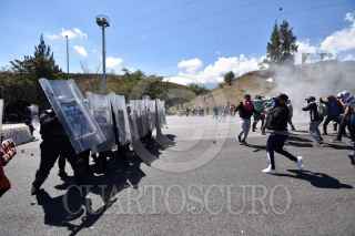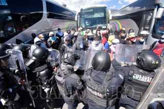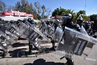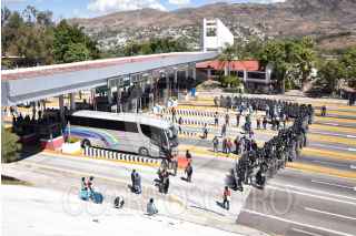 CHILPANCINGO, GUERRERO, 04FEBRERO2022. El enfrentamiento de estudiantes de Ayotzinapa con la Guardia Nacional (GN) y la Policía estatal de Guerrero dejó 21 policías lesionados: diez miembros de la GN y 11 policías estatales. Hasta el momento hay cinco detenidos. Por poco más de una hora, la caseta de Palo Blanco en la Autopista del Sol, en el estado de Guerrero, se vio envuelta en un intercambio de bombas molotov, piedras y gases lacrimógenos. Minutos después de las 11:30 horas de este viernes, personal de la GN y de la Policía estatal, con equipo antimotín, impidieron que estudiantes de la Escuela Normal Rural 'Raúl Isidro Burgos' de Ayotzinapa tomarán el control de la caseta de cobro de Palo Blanco. Desde la semana pasada la GN resguarda las casetas de cobro de esta autopista. Alrededor de las diez de la mañana, dos normalistas acudieron a esta caseta para solicitar permiso a las autoridades presentes, incluyendo a la presidenta de la Comisión de Derechos Humanos del Estado de Guerrero (CDHEG), Cecilia Narciso Gaytán, de tomar por una hora este tramo carretero y dejar el paso libre a los automovilistas, mientras realizaban un volanteo, mencionaron que en ningún momento pedirían cooperación a los automovilistas. Al no llegar a un acuerdo con las autoridades, una decena de autobuses arribó a la caseta para intentar tomarla por la fuerza, por lo que los policías y soldados presentes activaron su dispositivo de seguridad y cerraron totalmente la circulación a los automovilistas que iban a pasar por este punto. Esto provocó dos encapsulamientos, uno de normalistas y otro de militares, lo que generó un pequeño conato de bronca entre estudiantes y soldados. Los estudiantes lograron pasar dos camiones y su camioneta de sonido hasta las cabinas de cobro, donde quedaron encapsulados por dos grupos de antimotines de la GN, mientras que el resto de los estudiantes intentaron pasar la muralla de policías, dándose el primer enfrentamiento. Luego de esto, los normalistas realizaron un mitin político.