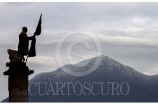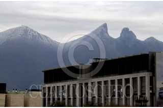 MONTERREY, NUEVO LEÓN, 04FEBRERO2022.- Vista del Cerro de la Silla desde el centro de Monterrey, cubierto de hielo en la parte alta, debido a las bajas temperaturas que se han registrado en el estado de Nuevo León. FOTO: GABRIELA PÉREZ MONTIEL / CUARTOSCURO.COM