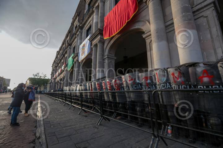 TOLUCA, ESTADO DE MÉXICO, 04FEBRERO2022.- Colectivas feministas realizaron un mural en honor y recuerdo a víctimas de feminicidio y desaparición forzada, colocando fichas de búsqueda de mujeres desaparecidas en el Estado de México desde el 2018 a la fecha y escribieron sus nombres en las paredes metálicas que se encuentran alrededor de la Plaza de los Mártires que se encuentra en remodelación, Palacio de Gobierno fue resguardado por policías estatales y colocaron vallas. FOTO: CRISANTA ESPINOSA AGUILAR /CUARTOSCURO.COM
