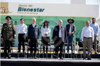 POLOTITLÁN, ESTADO DE MÉXICO, 05FEBRERO2022.- Andrés Manuel López Obrador, presidente de México, asistió a la conclusión de obra del Banco del Bienestar en la entidad mexiquense. Lo acompañan Carlos Torres Rosas,Coordinador General de Programas Integrales para el Bienestar; Luis Cresencio Sandoval González,secretario de la Defensa Nacional; Jesús Ramírez Cuevas, coordinador general de Comunicación Social y vocero de la Presidencia de la República; Alfredo del Mazo Maza, gobernador constitucional del Estado de México; Pamela López Ruiz, directora general del programa "La Escuela es Nuestra"; Marath BolañosLópez, subsecretario de Empleo y Productividad Laboral; Víctor Manuel Lamoyi Bocanegra, director general del Banco del Bienestar; Abraham Vázquez Piceno, coordinador Nacional del Programa de Becas para el Bienestar Benito Juárez; Ariadna Montiel Reyes, secretaria de Bienestar; Teresita Sánchez Barcena, presidente municipal de Polotitlán; María del Rocío García Reyes, subsecretaria de Bienestar y Juan Pablo De Botton Falcón, subsecretario de Egresos de la Secretaría de Hacienda y Crédito Público. FOTO: PRESIDENCIA/CUARTOSCURO.COM