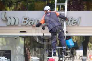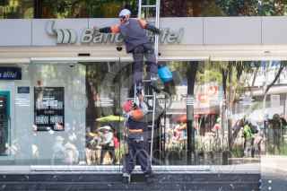 CIUDAD DE MÉXICO, 06FEBRERO2022.- Trabajadores de una empresa de limpieza privada se encargan de asear la fachada de una sucursal de Banca Mifel, en avenida Reforma. FOTO: MOISÉS PABLO/CUARTOSCURO.COM