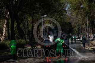 CIUDAD DE MÉXICO, 06FEBRERO2022.- Trabajadores de limpieza del gobierno capitalino asean los pasillos de la Alameda Central. FOTO: MOISÉS PABLO/CUARTOSCURO.COM