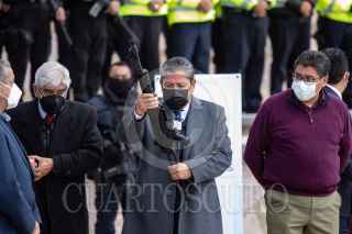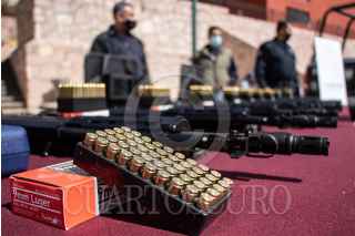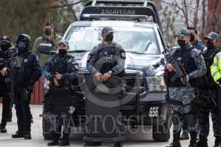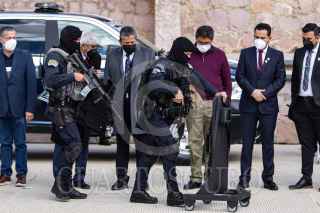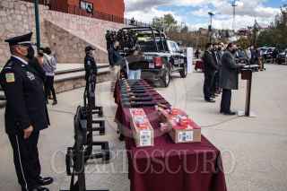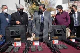 GUADALUPE, ZACATECAS, 07FEBRERO2022.- David Monreal Ávila, gobernador del Estado, encabezó la ceremonia en donde entregó armamento, equipo y patrullas a la Policía Estatal Preventiva y policías municipales para "fortalecer las fuerzas policiales que serán determinantes para recuperar la tranquilidad y paz social anhelada". Durante el evento realizado en las instalaciones de la SSP, estuvo acompañado por Adolfo Marín Marín, secretario de Seguridad Pública; Saúl Monreal y Humberto Salazar Contreras, presidentes municipales de Fresnillo y Jerez, respectivamente. FOTO: ADOLFO VLADIMIR /CUARTOSCURO.COM