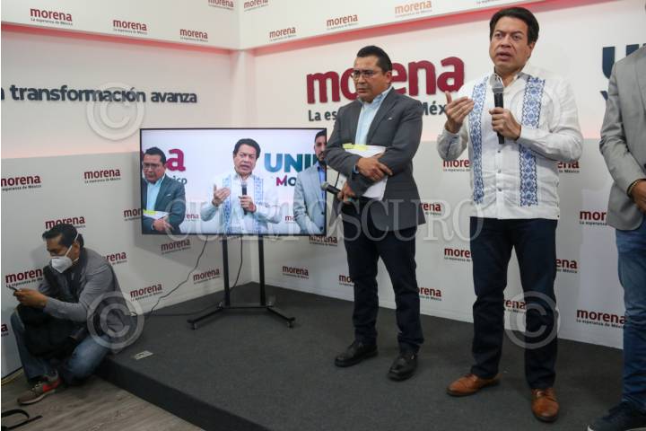 CIUDAD DE MÉXICO. 08FEBRERO2022.- Mario Delgado Carrillo, líder de Morena acompañado de Mario Llergo y Diego Hernández, en conferencia de prensa en la sede del partido hablaron sobre la revocación de mandato este próximo 10 de abril. FOTO: VICTORIA VALTIERRA/CUARTOSCURO.COM