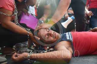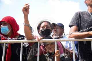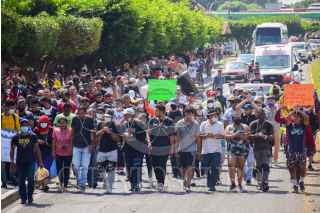 TAPACHULA, CHIAPAS, 08FEBRERO2022.- Migrantes marcharon del Parque Central rumbo a la Estación Migratoria Siglo XXI para exigir libertad de transito en el territorio nacional, y así poder seguir su camino hacia Estados Unidos. Denunciaron que se han topado con trámites burocráticos y con la corrupción de las autoridades migratorias para avanzar hacia su objetivo, situación que no han enfrentado en otros países en los que transitaron antes de llegar a México. Los manifestantes se encadenaron para hacer más contundente sus peticiones: "Quiero seguir mi camino pero en Chiapas nos están negando la libertad", sentenció un migrante. FOTO: DAMIÁN SÁNCHEZ/CUARTOSCURO.COM