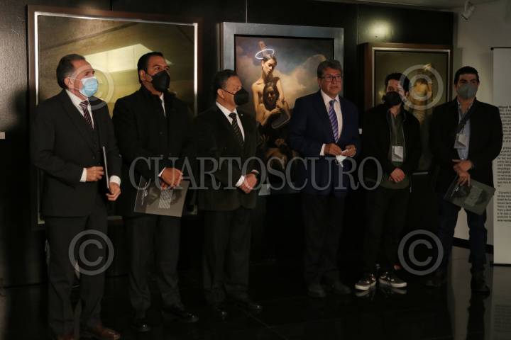 CIUDAD DE MÉXICO, 09OCTUBRE2022.- Miguel Madariaga, artista visual, Ricardo Monreal, coordinador del grupo parlamentario de Morena y senadores, durante la inauguración "Madariaga, la manía de ser normal" que estará expuesta en la planta baja de la Cámara de senadores. FOTO: ANDREA MURCIA /CUARTOSCURO.COM