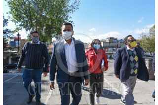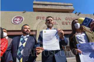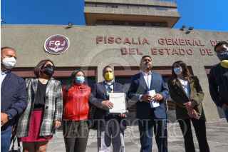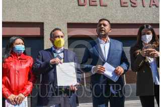 TOLUCA, ESTADO DE MÉXICO, 09FEBRERO2022.- Agustín Barrera presidente estatal del PRD en el Estado de México y Javier Rivera Escalona Secretario General del partido del Sol Azteca acompañados por integrantes de la dirección estatal acudieron a la Fiscalía General de Justicia del Estado de México a entregar un documento en donde exhortan a la fiscalía a investigar a fondo sobre el caso Texcoco y los descuentos salariales durante la administración de la actual Secretaria de Educación Federal, Delfina Gómez. FOTO: CRISANTA ESPINOSA AGUILAR /CUARTOSCURO.COM