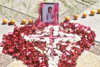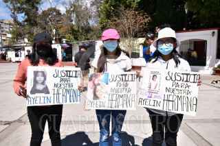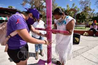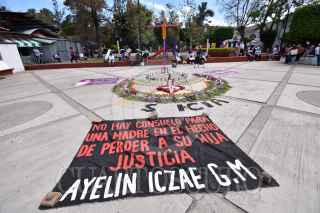TIXTLA DE GUERRERO, GUERRERO, 10FEBRERO2022.- Colectivos que reivindican la defensa de los derechos de la mujer, así como familiares de víctimas de desaparición forzada, colocaron una cruz en la Plaza Cívica del municipio de Tixtla en honor y exigencia de justicia por el caso de Ayelin Iczae Gutiérrez Marcelo, quien fuera desaparecida y privada de la vida en octubre de 2020. La jornada de este jueves fue instalada una cruz de metal color violeta de más de dos metros de altura, acompañada de una ofrenda floral en su base, para recordar a la menor originaria de Tixtla. Ayelin tenía 13 años de edad, fue localizada sin vida el 19 de octubre del 2020. Flor Marcelo, madre de Ayelin, refirió que la cruz representa no sólo a su hija, sino también a todas las mujeres asesinadas y desaparecidas en Guerrero. Desde el centro de Tixtla, la señora Marcelo lanzó una exigencia a las autoridades del estado para dar con los responsables de desaparecer, violar y mutilar a su hija, aplicándoles la pena máxima por la saña con la que actuaron contra la víctima. Cabe señalar que desde el día lunes, se inició una búsqueda en el lugar donde fue encontrado el cuerpo de la menor, terminando sus trabajos con 11 restos óseos encontrados en 3 días de trabajo, los cuales serán enviados para que se les realicen las pruebas genéticas correspondientes y así verificar que se traten de los restos faltantes de Ayelin. FOTO: DASSAEV TÉLLEZ ADAME/CUARTOSCURO.COM