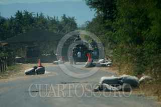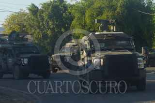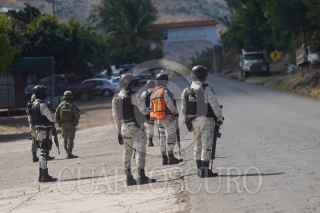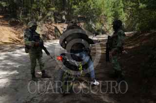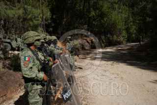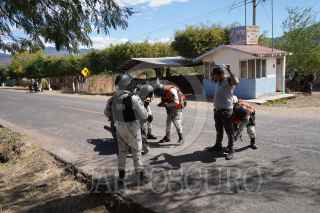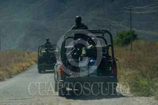AGUILILLA, MICHOACÁN 10FEBRERO2022. El Aguaje es la base de operación para la pacificación en Tierra Caliente del estado. El pueblo que ha sido atacado y afectado por la violencia y la guerra entre los grupos de la delincuencia organizada ahora está lleno de elementos del Ejército Mexicano. En el poblado hay casas abandonadas y baleadas y de acuerdo con pobladores, que omitieron su nombre, el ingreso de elementos del Ejército podría generar que las familias que abandonaron Tierra Caliente regresen. El quiosco de la plaza está lleno de agujeros, y el centro cultural que ahí albergaba, luce con cortinas llenas de balazos. Las pintas que existían del Cartel de Jalisco Nueva Generación (CJNG) han sido cubiertas con pintura azul. En la sierra, en la comunidad de Dos Aguas, la situación es fría y tensa, el Ejército no está adentro, pero si con controles cercanos. Luego del asesinato del líder del CJNG de Aguililla, el “M2”, este lugar se convirtió en el refugio de los remanentes, al menos así lo dicen los pobladores, sin embargo, en el lugar no hay movimiento ni vida; la señora de la tienda comentó que por la mañana se tocaron las campanas del pueblo para ver la llegada del Ejército, quienes acordaron mantenerse a las afueras de la comunidad. FOTO: JUAN JOSÉ ESTRADA SERAFÍN/CUARTOSCURO.COM