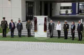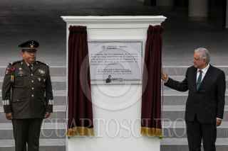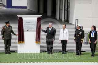 CIUDAD DE MÉXICO, 10FEBRERO2022.- Agustín Radilla Suastegui, Subsecretario de la Defensa Nacional; Andrés Manuel López Obrador, Presidente de México, y Claudia Sheinbaum, Jefa de Gobierno, develaron la placa por la inauguración de la Escuela Militar de Tropas Especialistas de la Fuerza Aérea en la en la Base Aérea Militar No. 1 Santa Lucía. FOTO: GOBIERNO DE LA CIUDAD DE MÈXICO/CUARTOSCURO.COM