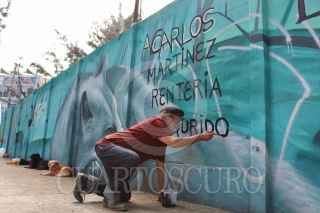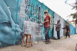 CIUDAD DE MÉXICO, 13FEBRERO2022.- El pintor Gabriel Macotela convocó a artistas y ciudadanos para pintar el mural ubicado en la avenida Yucatán, esquina con Insurgentes. La pinta del mural es en memoria de Carlos Martínez Rentería, reportero, escritor y promotor cultural que falleció el pasado 7 de febrero. Además, de acuerdo con Macotela, el mural es una expresión para pedir justicia por los periodistas que han sido asesinados en México. En años pasados se ha pintado en este mismo mural protestas en contra de las desapariciones y los feminicidios que ocurren en el país. FOTO: DENISSE HERNÁNDEZ/ CUARTOSCURO.COM