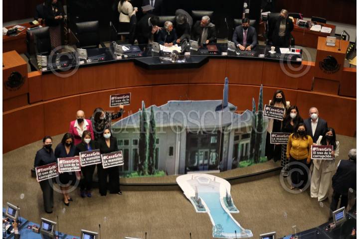 CIUDAD DE MÉXICO, 15FEBRERO2022.- Senadores del grupo parlamentario del PAN colocaron una maqueta de la "Casa Gris" exigiendo que se esclarezca el caso de posible conflicto de interés con el hijo de Andrés Manuel López Obrador, presidente de México y la empresa dueña de la casa y contratos millonarios de infraestructura en el país. FOTO: ANDREA MURCIA /CUARTOSCURO.COM