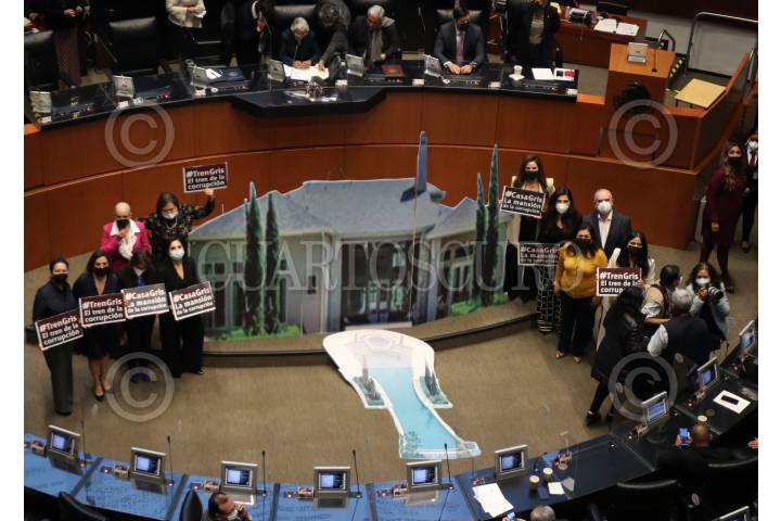 CIUDAD DE MÉXICO, 15FEBRERO2022.- Senadores del grupo parlamentario del PAN colocaron una maqueta de la "Casa Gris" exigiendo que se esclarezca el caso de posible conflicto de interés con el hijo de Andrés Manuel López Obrador, presidente de México y la empresa dueña de la casa y contratos millonarios de infraestructura en el país. FOTO: ANDREA MURCIA /CUARTOSCURO.COM