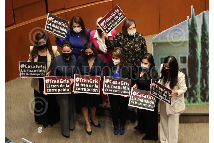 CIUDAD DE MÉXICO, 15FEBRERO2022.- Senadores del grupo parlamentario del PAN colocaron una maqueta de la "Casa Gris" exigiendo que se esclarezca el caso de posible conflicto de interés con el hijo de Andrés Manuel López Obrador, presidente de México y la empresa dueña de la casa y contratos millonarios de infraestructura en el país. FOTO: ANDREA MURCIA /CUARTOSCURO.COM