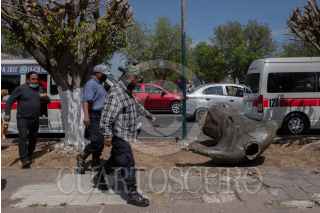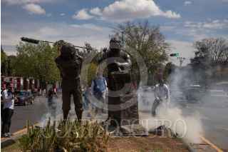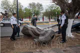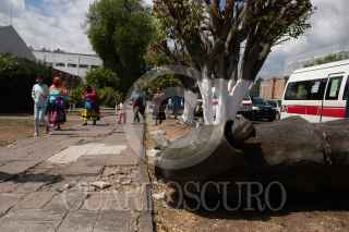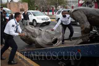 MORELIA, MICHOACÁN, 15FEBRERO2022. Integrantes del Consejo Supremo Indígena de Michoacán echaron abajo las estatuas de Fray Antonio de San Miguel y un ingeniero de la época de la Conquista, que daban órdenes a un indígena que cargaba una losa de cantera sobre la espalda y a otro que labraba una roca. Los inconformes señalaron que desde septiembre de 2020 habían solicitado la remoción de esta obra, ubicada al final del acueducto de la ciudad, al considerarla "ofensiva y símbolo del esclavismo y genocidio español". Policías llegaron al lugar para retirar las piezas, no hubo detenidos por este hecho. FOTO: ESPECIAL /CUARTOSCURO.COM