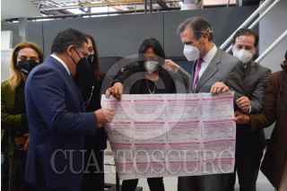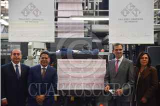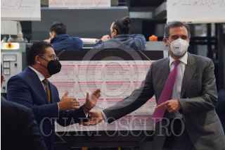 CIUDAD DE MÉXICO, 16FEBRERO2022.- Lorenzo Córdova, consejero presidente del Instituto Nacional Electoral; Rabindranath Salazar Solorio; Subsecretario de Desarrollo Democrático, Participación Social y Asuntos Religiosos de la Segob; y Abraham Ezequiel Zurita Capdepont, director General de Talleres de México, encabezaron el arranque de la impresión de la papeleta para la consulta ciudadana con motivo de la revocación de mandato. FOTO: MARIO JASSO/CUARTOSCURO.COM