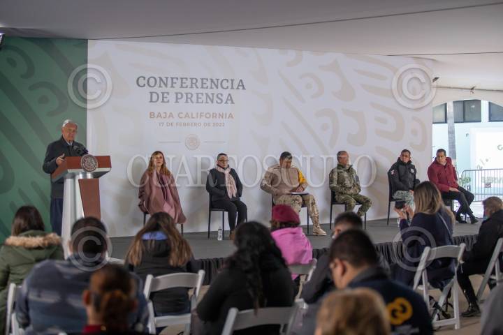 TIJUANA, BAJA CALIFORNIA, 17FEBRERO2022.- Andrés Manuel López Obrador, Presidente de México, ofreció su acostumbrada mañanera en la Zona Militar 2. Lo acompañaron María del Pilar Ávila Olmeda, gobernadora de Baja California; Rosa Icela Rodríguez, secretaria de Seguridad y Protección Ciudadana; Luis Cresencio Sandoval, secretario de la Defensa; José Rafael Ojeda Durán, secretario de la Marina; Luis Rodriguez Bucio, comandante de la Guardia Nacional, y Ricardo Mejía Berdeja, subsecretario de Seguridad Pública. FOTO: OMAR MARÍNEZ/CUARTOSCURO.COM