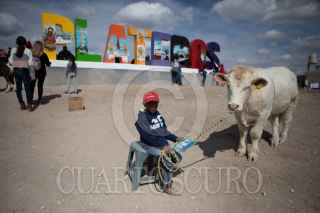 FRESNILLO, ZACATECAS, 17FEBRERO2022.- Un pequeño ofrece fotografías con un toro, como recuerdo de los visitantes al cerro en donde se encuentra del Santo Niño de Atocha gigante, en la comunidad de Plateros. FOTO: ADOLFO VLADIMIR /CUARTOSCURO.COM