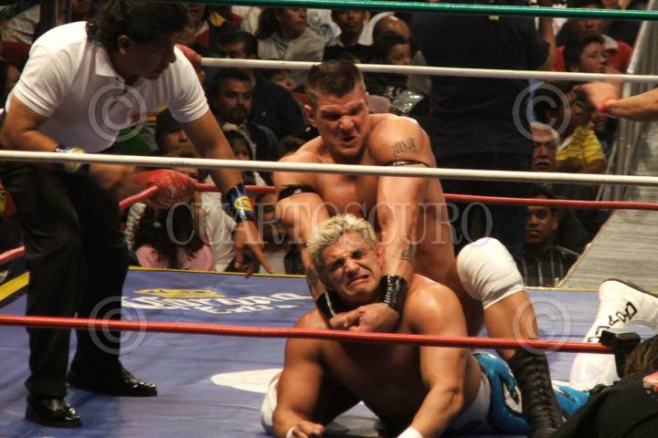 MÉXICO, D.F. 17NOVIEMBRE2006.- El luchador Shocker es sometido por integrante de la secta extranjera en la noche de lucha libre en la arena México. FOTO: SAÚL LÓPEZ/CUARTOSCURO.COM