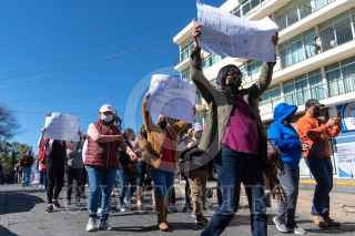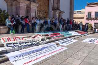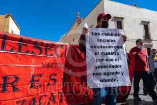 ZACATECAS, ZACATECAS, 18FEBRERO2022.- Docentes integrantes del Movimiento Democrático del Magisterio Zacatecano marcharon por las principales calles del Centro Histórico de la Capital dirigiéndose a la explanada del Congreso del Estado. Dicha movilización se realizo ante el reclamo por el pago completo de sus salarios, estas la segunda quincena del mes de Enero y la primera del mes en curso. El gobierno estatal tendría de pazo hasta el 12 de febrero para depositar las quincenas que se adeudan, sin embargo hasta reflejar el 100 porciento de estos pagos, los maestros continuaran con el paro laboral y la toma de edificios municipales y del estado. FOTO: DIANA VALDEZ