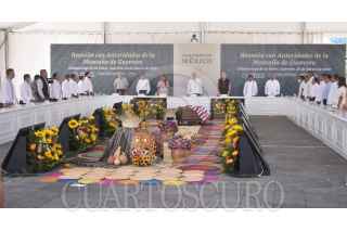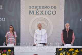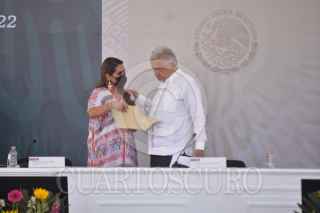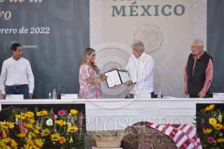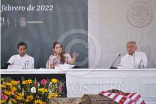 CHILPANCINGO, GUERRERO, 20FEBRERO2022.- El Presidente de la República, Andrés Manuel López Obrador, presidio en Chilpancingo la Reunión con Autoridades de la Región Montaña del estado de Guerrero, acompañado por parte del gabinete federal y la gobernadora Evelyn Salgado Pineda. En esta reunión puso en marcha en Guerrero el programa de rehabilitación de 66 caminos artesanales que tendrá una inversión de 50 mil millones de pesos en beneficio de medio millón de guerrerenses de 23 municipios de La Montaña y Costa Chica. El mandatario federal se dijo comprometido con el estado y reconoció que la nación tiene un compromiso con Guerrero, "no se podría concebir la historia de México sin Guerrero. Tenemos una deuda historia con este estado". Los acompañaron Rogelio Ramírez de la O, secretario de Hacienda y Crédito Público, y Jorge Arganis Díaz Leal, secretario de Infraestructura, Comunicaciones y Transportes. FOTO: DASSAEV TÉLLEZ ADAME/CUARTOSCURO.COM
