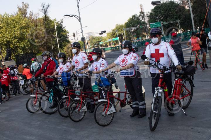 CIUDAD DE MÉXICO, 20FEBRERO2022.- Fernando Suinaga Cárdenas, presidente nacional de la Cruz Roja Mexicana; Alessandra Guiseppina Grossi Herrera, ciclista profesional; y paramédicos de esta benemérita institución, realizaron la primera rodada ciclista conmemorando de los 112 años de Acción Humanitaria de la Cruz Roja Mexicana, el contingente partió de la Estela de Luz al edifico de la Lotería Nacional. FOTO: MOISÉS PABLO/CUARTOSCURO.COM