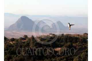 ZACUALPAN DE AMILPAS, MORELOS, 20FEBRERO2022.- Un colibri juguetea durante la mañana de este dia, al fondo se delinea la figura de los peñoñes de Jantetelco. FOTO: MARGARITO PÉREZ RETANA / CUARTOSCURO.COM
