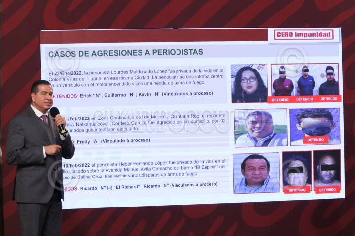 CIUDAD DE MÉXICO, 21FEBRERO2022.- Andrés Manuel López Obrador, Presidente de México, encabezó la conferencia matutina en Palacio Nacional. Lo acompañaron Rosa Icela Rodríguez, secretaria de Seguridad y Protección Ciudadana; Luis Cresencio Sandoval, secretario de la Defensa Nacional; José Rafael Ojeda Durán, secretario de la Marina; Ricardo Sheffield Padilla, director de Profeco; Luis Rodríguez Bucio, comandante de la Guardia Nacional y Ricardo Mejía Berdeja, subsecretario de Seguridad; Adán Augusto López, secretario de Gobernación, y Jesús Ramírez Cuevas, Vocero de la Presidencia. FOTO: MOISÉS PABLO/CUARTOSCURO.COM