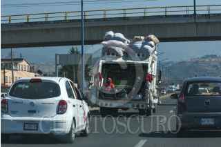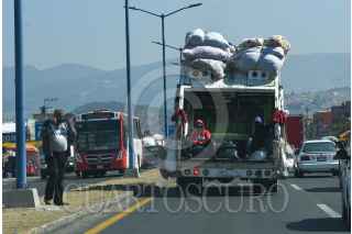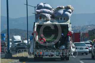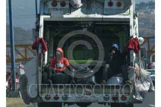 XONACATLÁN, ESTADO DE MÉXICO, 22FEBRERO2022.- Dos trabajadores del sistema de recolección de basura de Otzolotepec viajan en la parte trasera del camión de basura descansando un poco en lo que llegan a su siguiente punto para recoger basura. FOTO: CRISANTA ESPINOSA AGUILAR /CUARTOSCURO.COM