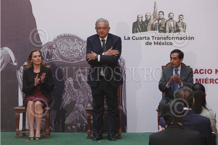 CIUDAD DE MÉXICO, 23FEBRERO2022.- Andrés Manuel López Obrador, presidente de México, acompañado de su esposa Beatriz Gutiérrez Müller y Rogelio Ramírez de la O, secretario de Hacienda y Crédito Público, encabezaron la ceremonia del CIX Aniversario luctuoso de Francisco I. Madero, realizado en el Patio de Honor en Palacio Nacional. FOTO: GRACIELA LÓPEZ /CUARTOSCURO.COM