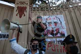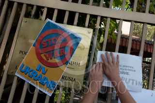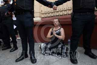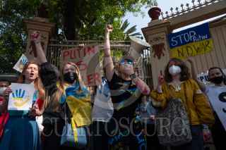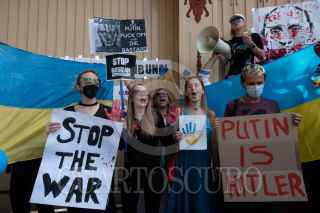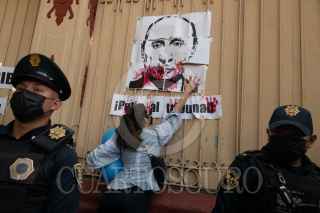 CIUDAD DE MÉXICO, 24FEBRERO2022.- Integrantes de la comunidad ucraniana protestaron para exigir justicia por la "operación militar especial" que el presidente de Rusia, Vladimir Putin, declaró esta madrugada afectando a cientos de familias debido a los bombardeos en diferentes ciudades de Ucrania. Putin dijo que dicha operación se enfocará en la desmilitarización y desnazificación de Ucrania. La protesta se realizó afuera de la Embajada de Rusia. FOTO: GRACIELA LÓPEZ /CUARTOSCURO.COM