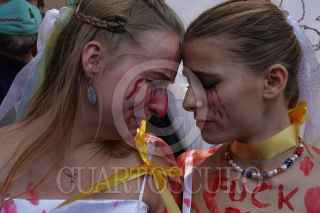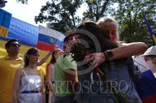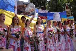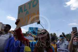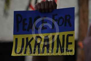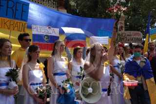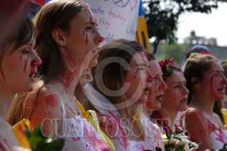 CIUDAD DE MÉXICO, 26FEBRERO2022.- Ucranianos residentes en México se manifestaron frente a la embajada Rusa para exigir un alto al fuego y a la Guerra iniciada por la nación en territorio ucraniano en días pasado. Las y los manifestantes portaron bandera, pancartas y realizaron un perfomance en donde denunciaron la violencia que están viviendo al interior del país. FOTO: GALO CAÑAS/CUARTOSCURO.COM