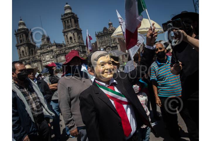 CIUDAD DE MÉXICO, 27FEBRERO2022.- Al rededor de 200 simpatizantes del presidente Andrés Manuel López Obrador congregaron en el Zócalo para expresar su apoyo por su iniciativa a la reforma eléctrica y a la consulta de revocación de mandato. Como parte de la manifestación, también hubo consignas contra supuestos “opositores” del mandatario, entre ellos los consejeros del Instituto Nacional Electoral (INE) y periodistas como Carmen Aristegui. FOTO: ANDREA MURCIA /CUARTOSCURO.COM