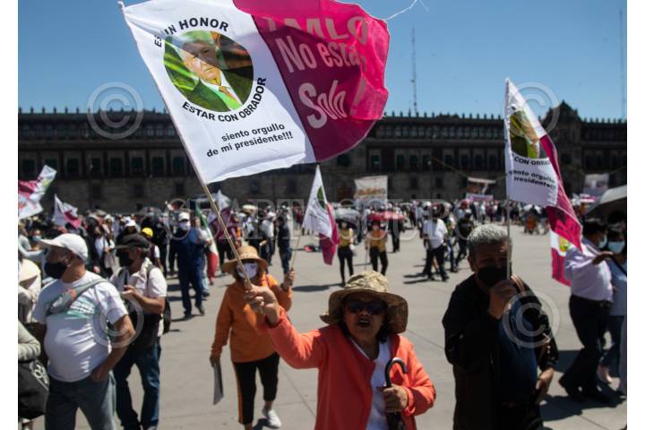 CIUDAD DE MÉXICO, 27FEBRERO2022.- Al rededor de 200 simpatizantes del presidente Andrés Manuel López Obrador congregaron en el Zócalo para expresar su apoyo por su iniciativa a la reforma eléctrica y a la consulta de revocación de mandato. Como parte de la manifestación, también hubo consignas contra supuestos “opositores” del mandatario, entre ellos los consejeros del Instituto Nacional Electoral (INE) y periodistas como Carmen Aristegui. FOTO: ANDREA MURCIA /CUARTOSCURO.COM