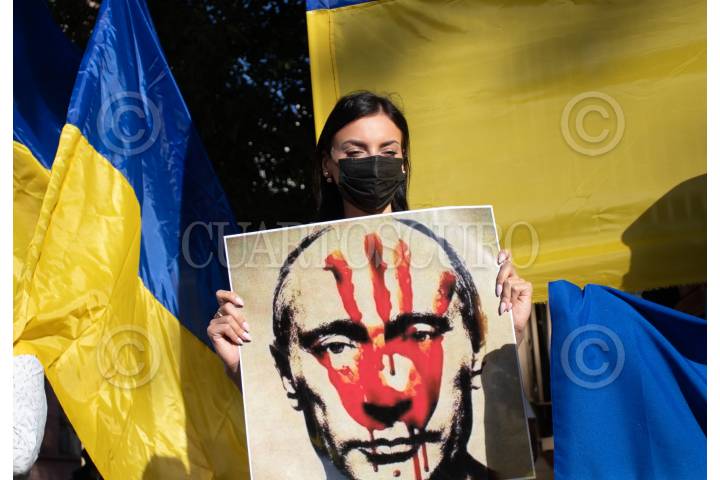 CIUDAD DE MÉXICO, 28FEBRERO2022.- Personas con nacionalidad ucraniana se manifestaron frente la embajada de Rusia para pedir a esta que se nombrara en contra de las acciones de Vladimir Putin. También para mostrar apoyo a sus familiares que se encuentran en Ucrania. FOTO: ANDREA MURCIA /CUARTOSCURO.COM