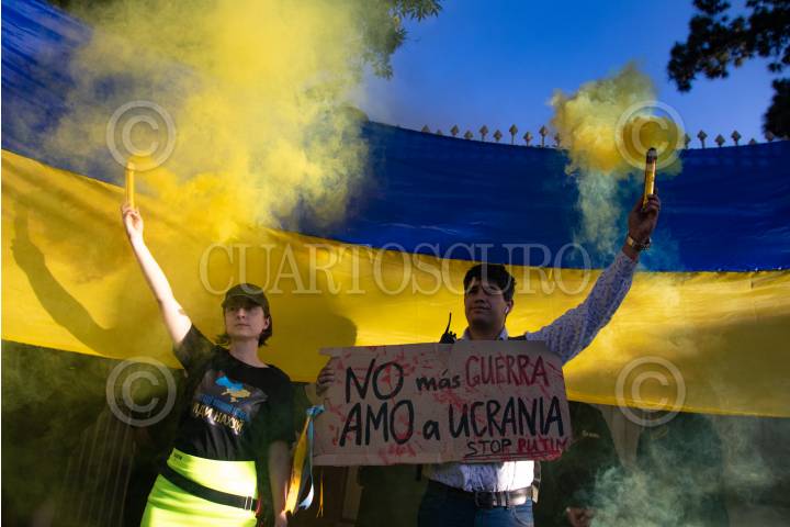 CIUDAD DE MÉXICO, 28FEBRERO2022.- Personas con nacionalidad ucraniana se manifestaron frente la embajada de Rusia para pedir a esta que se nombrara en contra de las acciones de Vladimir Putin. También para mostrar apoyo a sus familiares que se encuentran en Ucrania. FOTO: ANDREA MURCIA /CUARTOSCURO.COM