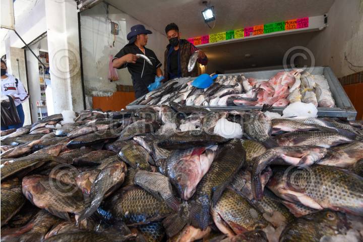 ZINACANTEPEC, ESTADO DE MÉXICO, 01MARZO2022.- A un día de iniciar la Cuaresma vendedores de pescados y mariscos de San Luis Mextepec en el municipio de Zinacantepec se encuentran listos con una gran variedad de pescados, a pesar de que sus ventas se han visto afectadas desde el inicio de la pandemia por COVID-19 confían en que este año puedan reponerse un poco, sus precios se incrementaron aproximadamente un 30 por ciento, lo que más le piden sus clientes son mojarras, carpas, charla por ser más económico. FOTO: CRISANTA ESPINOSA AGUILAR /CUARTOSCURO.COM